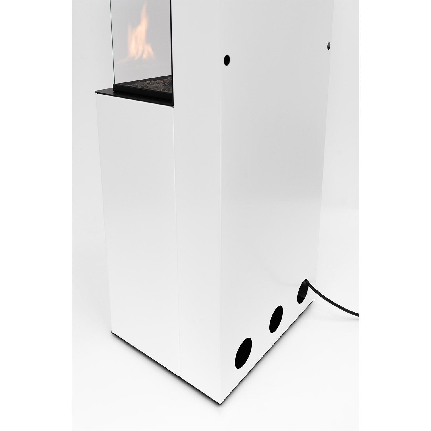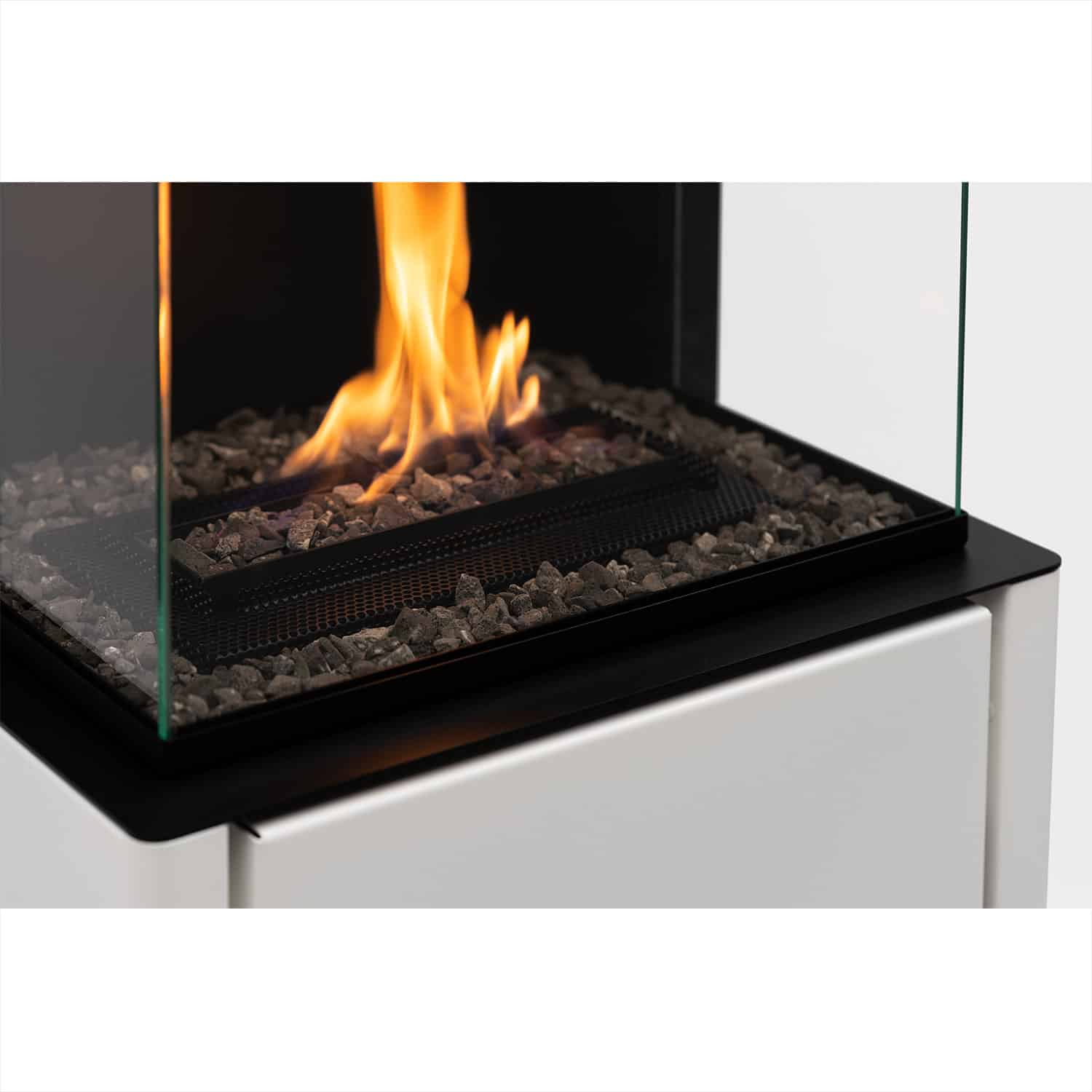 • Les flammes, visibles sur trois faces, sont sublimées par le contraste avec le fond noir du foyer.