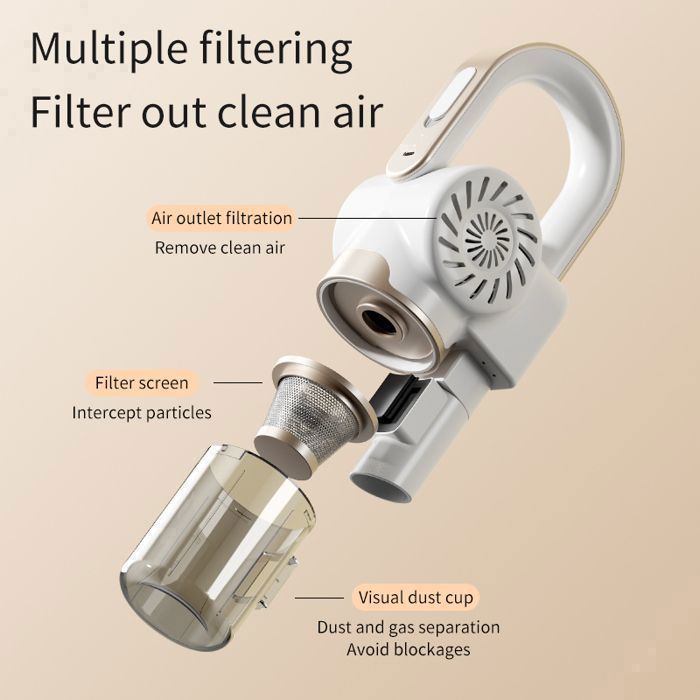 Il s’agit d’un aspirateur à main sans fil avec batterie 2000mAH, puissance 100W, tension de fonctionnement 7.4V, fréquence 8000 fois/min, capacité du godet 260ML, aspiration 11Kpa, sans sac, couleur blanche. Il peut répondre à vos besoins quotidiens.