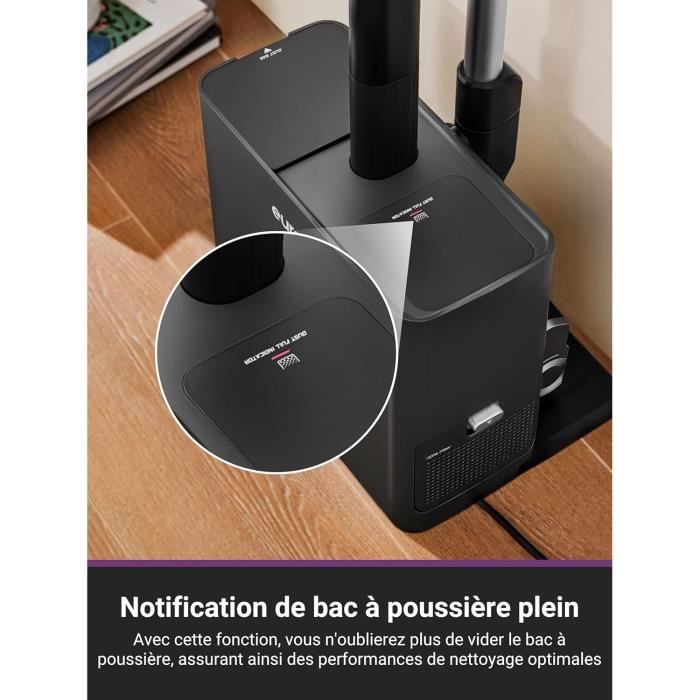Vidage Automatique de la PoussièreProfitez du confort mains libres avec notre station de vidage automatique de la poussière. Placez simplement l’aspirateur balai sans fil sur le dessus pour vider automatiquement le bac à poussière, gardant vos mains, l’air et les sols propres.