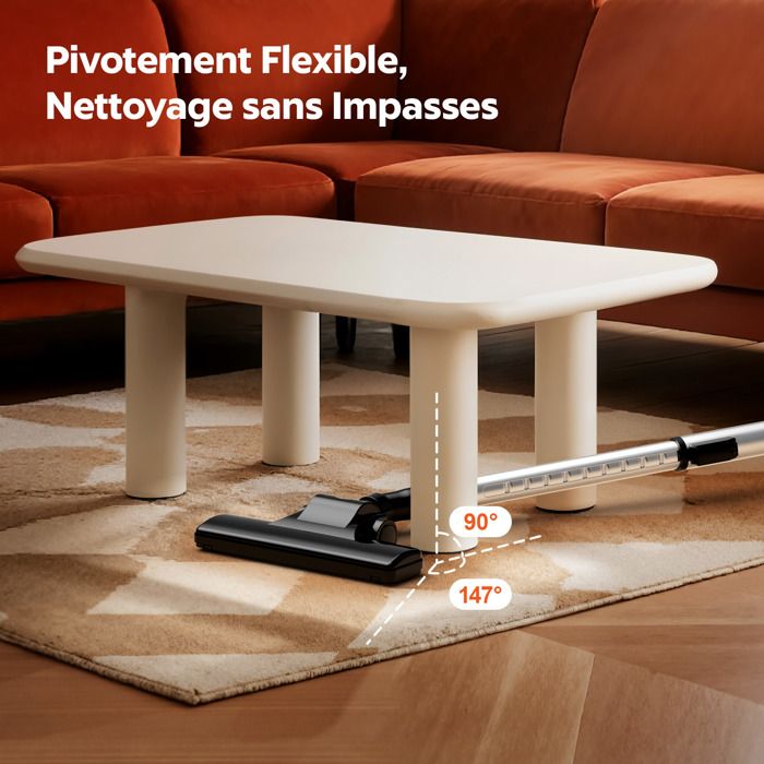 Comprend une brosse à plancher réglable à 90° + une brosse convertible 2 en 1, adaptée aux sols durs, carrelages et moquettes. Conçue en matériau léger, la brosse se tient facilement d’une main. La brosse à plancher s’adapte au sol pour atteindre les fonds des meubles, tandis que la brosse convertible se transforme en mode fente pour nettoyer précisément les coins, les interstices des canapés et les sièges de voiture. En mode brosse, elle aspire efficacement les poils d’animaux et les cheveux sur canapés et moquettes, garantissant un nettoyage sans angle mort.