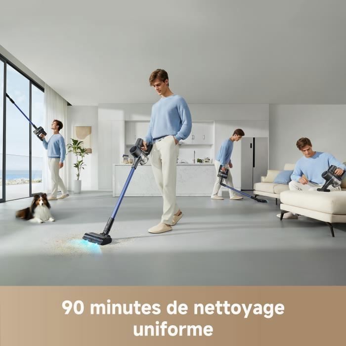 La brosse multisurface polyvalente avec un design anti-nœuds nettoie sans effort une grande variété de surfaces, des sols durs aux tapis et moquettes. Le moteur à haute vitesse sans balais capture efficacement les cheveux, la saleté, la poussière et les débris grâce à son aspiration puissante de 150 AW, assurant un nettoyage optimal.
