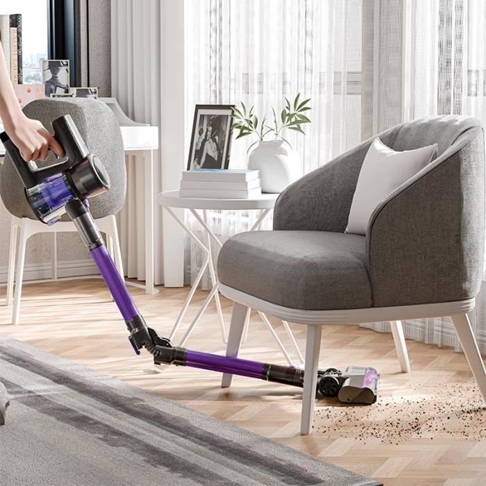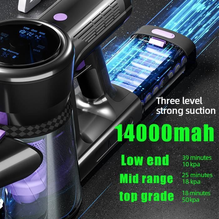 1. Nettoyage puissant de 250 W et 50 KPA : utilisant un moteur sans balais haute puissance de 250 W et une batterie lithium-ion de 7 x 2000 mAh, le puissant aspirateur sans fil a une puissance allant jusqu’à 50 000 PA, vous offrant une expérience de nettoyage silencieuse et efficace. L’aspirateur balai sans fil peut régler la puissance de l’aspirateur dans la plage de 10 à 50 KPA. S’adapter à l’inhalation de différents types de substances.2. 40 minutes d’autonomie et batterie amovible : Cet aspirateur puissant dure jusqu’à 40 minutes en mode 10KPA. La batterie peut être retirée à tout moment et chargée séparément. Des piles supplémentaires peuvent également être achetées pour prolonger la durée de vie des piles.3. Rappel d’affichage LED intelligent : le grand écran LED affiche la puissance de la batterie en temps réel, et l’affichage de réglage à trois vitesses rend l’opération simple et claire.4. Filtration haute efficacité à 7 couches de grande capacité 1,0 L : en plus de la couche filtrante conventionnelle, l’aspirateur ajoute également un filtre HEPA à la sortie du moteur. La poussière et la saleté sont bloquées dans la grande poubelle de 1,0 L, et plus de propreté. est libéré de l’air.5. L’aspirateur sans fil trois en un est équipé de rouleaux à poils souples et à poils durs, ce qui réduit le remplacement fréquent des rouleaux et l’usure de la brosse électrique pour sols. Livré avec un tube en aluminium rétractable, une brosse anti-fissures et une brosse ronde pour que vous puissiez l’utiliser dans les endroits élevés, les escaliers, les crevasses, les dessus de table et plus encore.