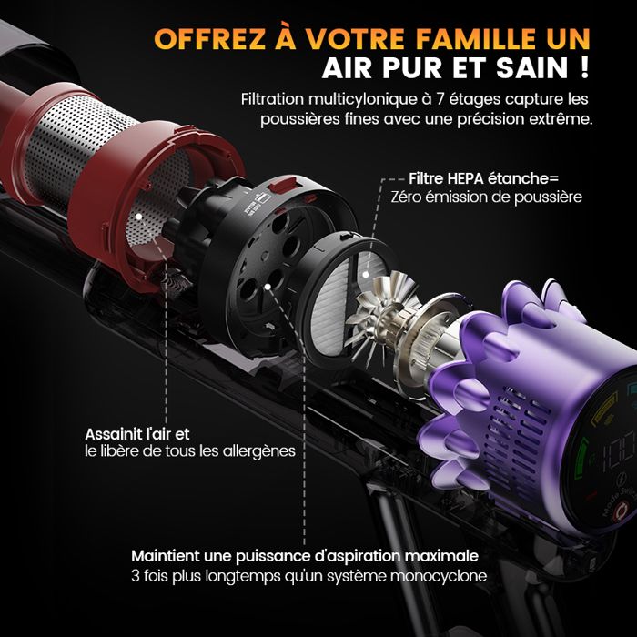 🌱【Système de filtration à 7 niveaux】Notre aspirateur balai sans fil est équipé d’un système de séparation cyclonique multi-cône,système de filtration scellé à haute efficacité à 7 couches capturent 99,99 % des particules jusqu’à 0,1 micron, y compris les bactéries et les acariens, libèrent de l’air propre après le nettoyage fréquent🍃, pour ce qui en fait le choix idéal pour les personnes allergiques et les propriétaires d’animaux.