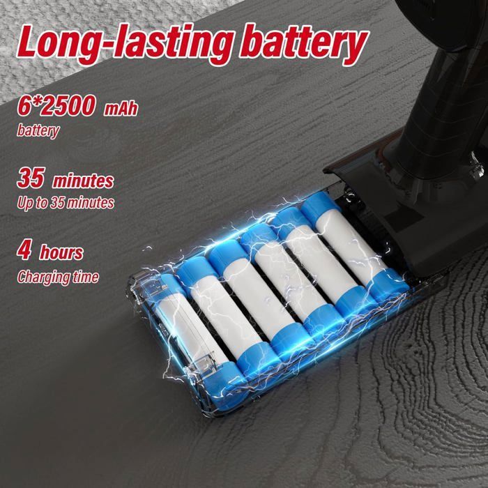 | Batterie | Aspirateur sans-fil offre jusqu’à 35 mins d’autonomie en mode standard et jusqu’à 15 mins en mode d’alimentation. |