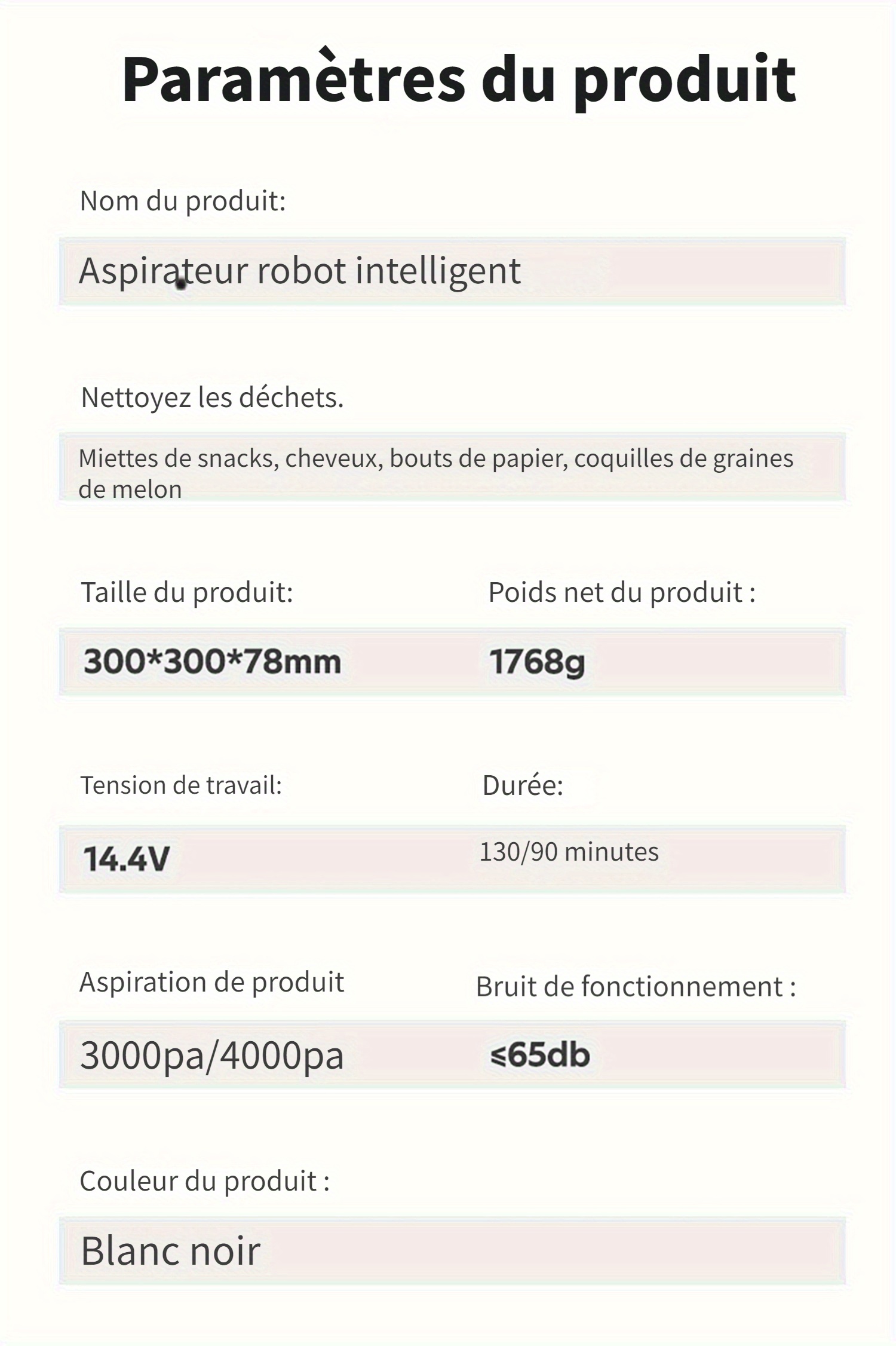 Paramètres du produit Puissance nominale : 26W Aspiration: 4000pa Capacité de la batterie : 3000 mAh/14.4V Durée : 130 min Temps de charge : 4.5h Bruit : =65dB Poubelle : 400 ml réservoir d’eau : 100ml Poids net : 1768g Poids brut : 2916g mode de navigation : Gyroscope Planification du chemin : itinéraire en zigzag Anti-chute : oui Contrôle APP: oui