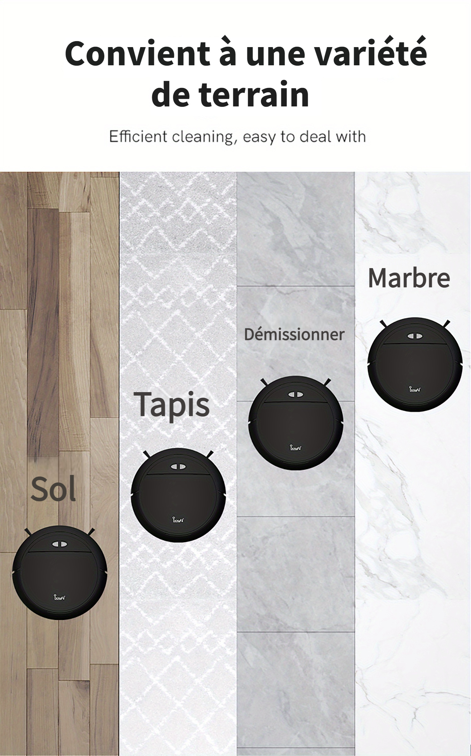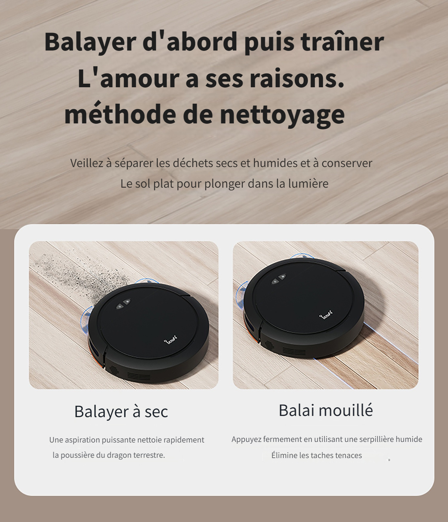 Design Compact et Facile d’Utilisation : Compact et élégant, ce robot aspirateur s’intègre parfaitement dans votre intérieur. Avec une interface facile à utiliser, même les débutants peuvent facilement maîtriser son fonctionnement.
