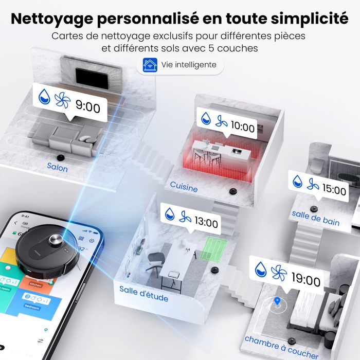 Grâce à l’application Proscenic, vous pouvez personnaliser votre nettoyage en définissant des horaires de nettoyage, en ciblant des pièces spécifiques, en ajustant les niveaux d’aspiration ou d’eau, en désignant des zones interdites, et plus encore.