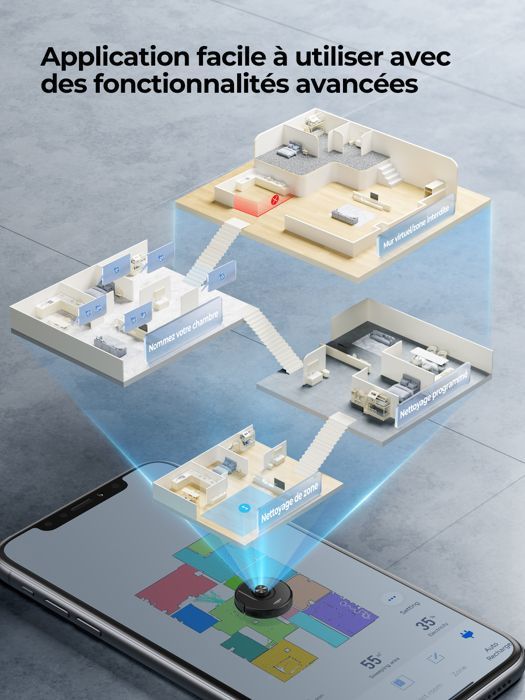 Le robot aspirateur utilise une technologie de cartographie intelligente pour créer une carte détaillée de votre domicile, lui permettant de naviguer efficacement et avec précision lors du nettoyage.