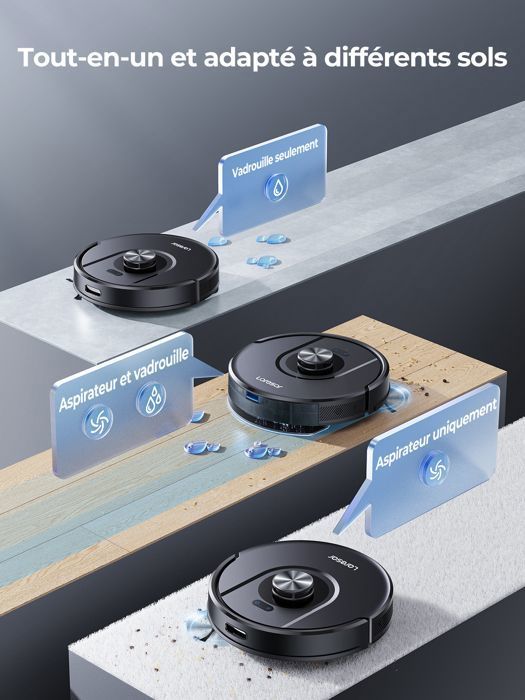 Le robot aspirateur et laveur combine une aspiration puissante allant jusqu’à 5000Pa, ce qui permet de nettoyer efficacement les moquettes, les sols durs, les poils d’animaux domestiques et les autres débris. Il est également équipé d’un capteur intelligent qui ajuste la force d’aspiration en fonction des différents types de sol, assurant un nettoyage en profondeur sans endommager vos sols.