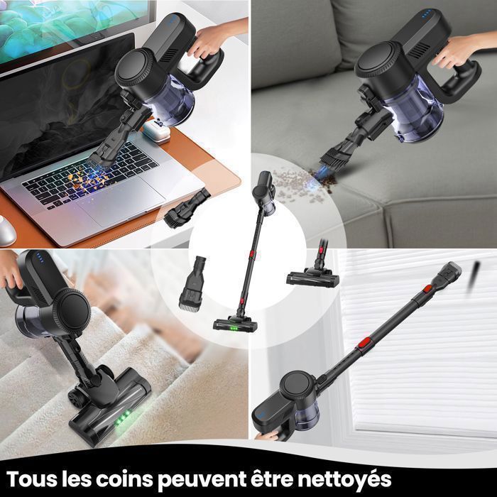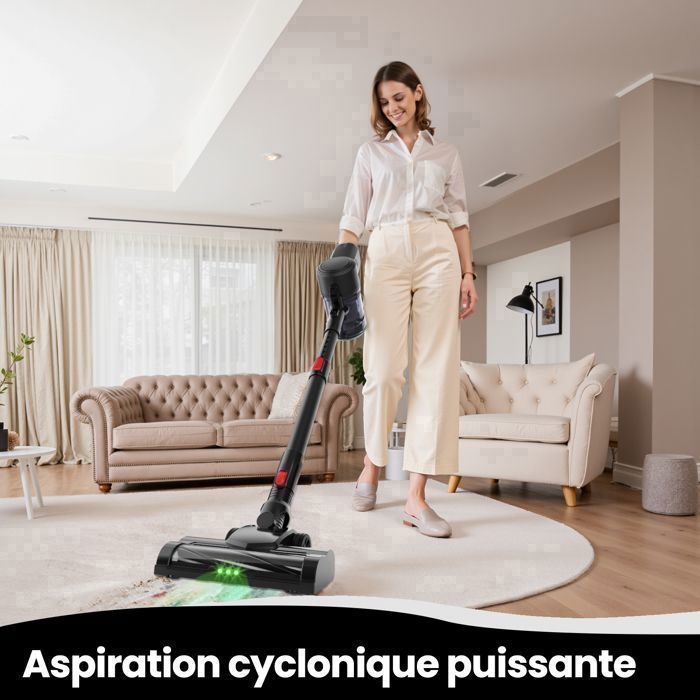Cet aspirateur peut facilement nettoyer les zones difficiles d’accès, des poils et de la poussière aux déchets/mondures de grande taille. Sa puissance d’aspiration maximale de 30000PA est suffisante pour faire face aux déchets ménagers courants. Cet aspirateur sans fil adopte également un design conçu pour protéger les sols des rayures.