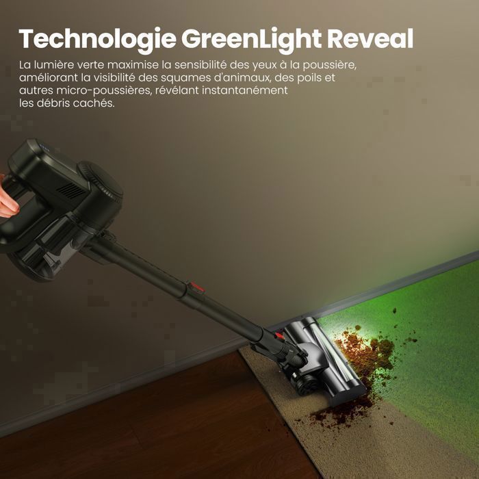La lumière verte maximise la sensibilité de l’œil aux poussières, accentue la visibilité instantanée des débris cachés (comme les pellicules animales, les poils et autres micro-poussières), vous permettant d’éliminer facilement les résidus.