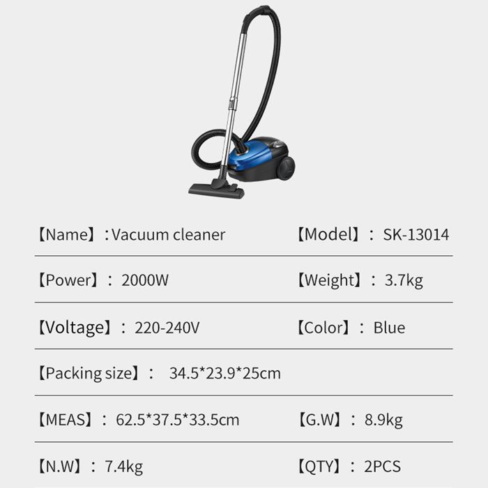 Capacité : 1,5 L Puissance : 2000 W Cordon d’alimentation : 4,5 m Puissance d’aspiration : 15 000 Pa Efficacité énergétique : Classe A Niveau sonore maximal : 76 dB Matériau : ABS + composants électroniques Dépoussiéreur sans sac – Système hygiénique pour vider la poussière Dimensions de l’emballage : 34,5 x 23,9 x 25 cm Inclus : 2 unités principales + 2 embouts + 1 perche télescopique + 1 tube d’aspiration + 1 manuel d’instructions