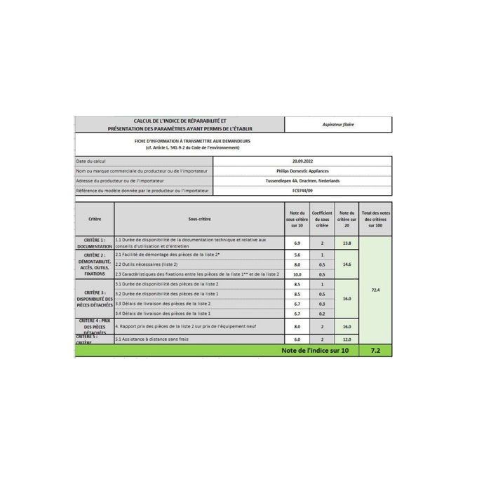 | Indice de réparabilité | 7,2 |