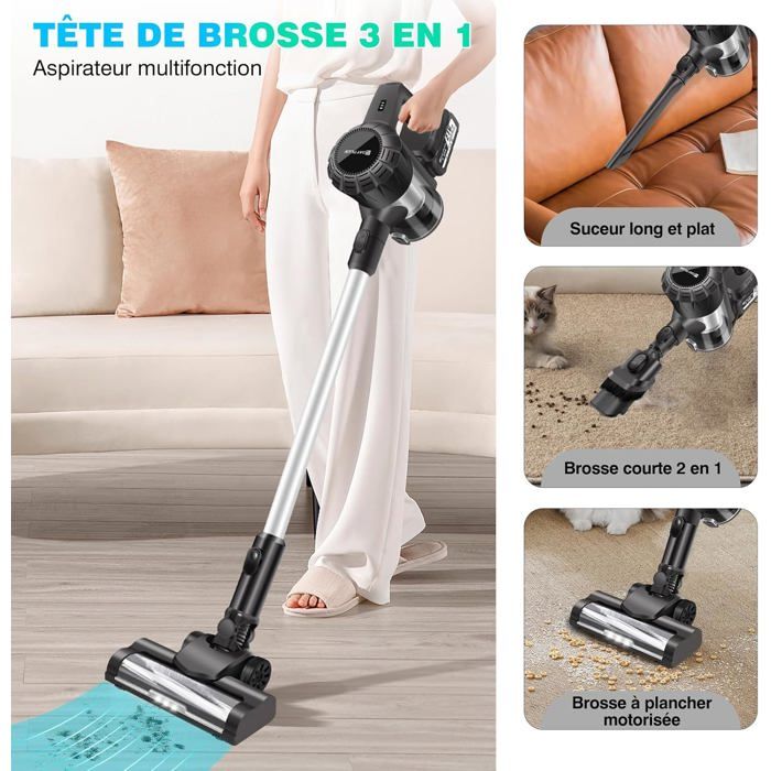 [Aspiration puissante et longue durée]Cet aspirateur balai possède une puissance d’aspiration de 3800 W, pour un nettoyage en profondeur sur toutes les surfaces Avec une autonomie allant jusqu’à 65 minutes, vous pouvez nettoyer toute la pièce sans avoir à recharger l’appareilÉclairage LED La lumière LED brillante de la tête d’aspirateur sans fil permet de repérer facilement la saleté et les débris, même dans les recoins les plus sombres de la maison, pour un nettoyage précis[Technologie de filtration exceptionnelle]Le système de filtration à cinq couches capture 99,9 % des poussières fines et des particules aussi petites que 0,3 micron, pour un air pur et frais Moteur sans balais amélioré avec deux options de puissance Cet aspirateur sans fil est équipé d’un moteur sans balais haute performance, qui offre une aspiration exceptionnelle en mode MAX Choisissez différents modes d’aspiration (MaxStandard) pour vous adapter à différents scénarios et réduire ainsi votre consommation d’énergie [Rouleau à brosse dure et douce]Aspirateurs adaptés à diverses surfaces (bois dur, tapis à poils courts et moyens, carrelage, marbre)