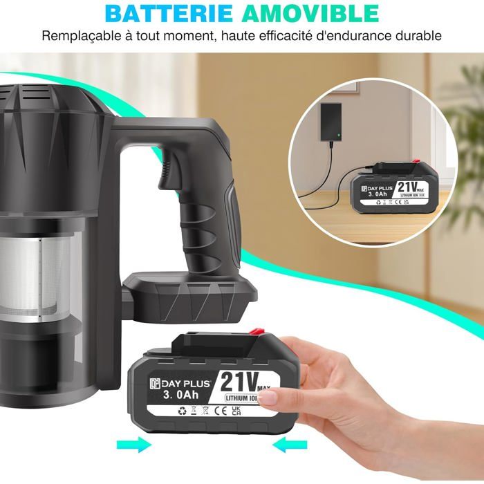 | Caractéristiques particulières | Cet aspirateur balai sans fil est équipé d’un moteur amélioré et d’une batterie intégrée de 3000mAh, prend en charge 2 modes d’alimentation d’alimentation avec une aspiration puissante jusqu’à 15000Pa, économise de l’énergie et a une longue durée de vie. La vitesse maximale permet une aspiration plus forte pour ramasser les débris tels que les poils d’animaux et la litière de chat sur les sols durs et les tapis à poils courts. |