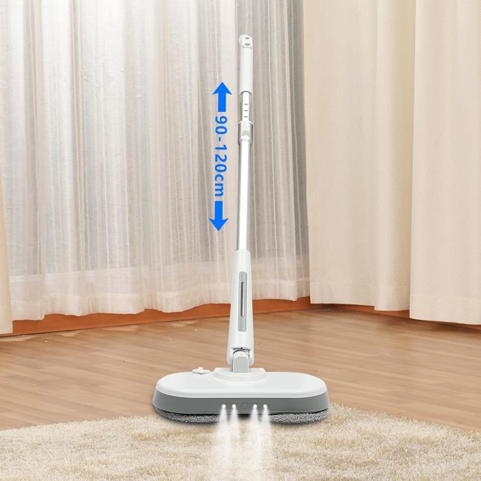 Nettoyage polyvalent : une silhouette mince, une tête de balai rotative de 3,15 pouces d’épaisseur et des lumières LED permettent un nettoyage plus profond et plus approfondi de votre maison, y compris le dessous des canapés, sous le lit, dans les coins de table et autres coins difficiles d’accès. Ainsi, vous pouvez profiter du temps parent-enfant sur le sol sans vous soucier du sol sale.Batterie longue durée : la batterie lithium-ion de 2000 mAh avec protection contre la surcharge, la décharge et les surintensités assure une plus longue durée de vie de la batterie sans vous soucier de trop peu d’électricité qui affecte votre nettoyage. L’adaptateur fourni peut aider à charger pour économiser de l’argent et de l’énergie.Fonctions multiples : cette serpillère électrique dispose d’un mode sec, humide et cire. Il peut également être utilisé pour nettoyer les fenêtres et les portes (il est nécessaire de la cire avant de l’essuyer pour éviter les rayures), ce qui est pratique pour votre vie.