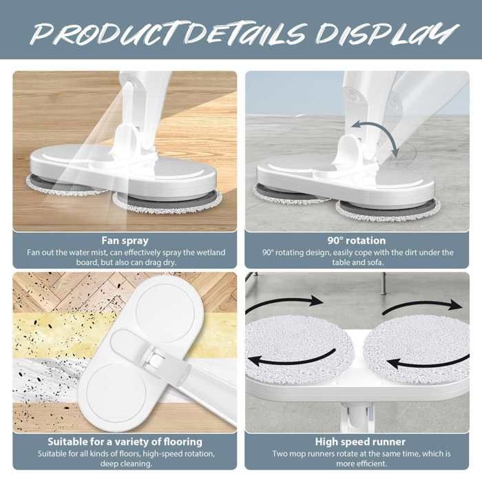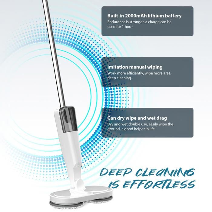 Dites adieu aux serpillières à main avec la serpillière électrique sans fil ! Ses deux moteurs assurent une rotation à grande vitesse pour un nettoyage en profondeur sans effort. Son grand réservoir d’eau de 150 ml évacue l’eau en continu et nettoie un appartement de 100 m² à la fois. Sa batterie au lithium de 2000 mAh se charge rapidement en 1 heure et offre une autonomie de 60 minutes. Son design ultra-silencieux ne dérange pas les autres.
