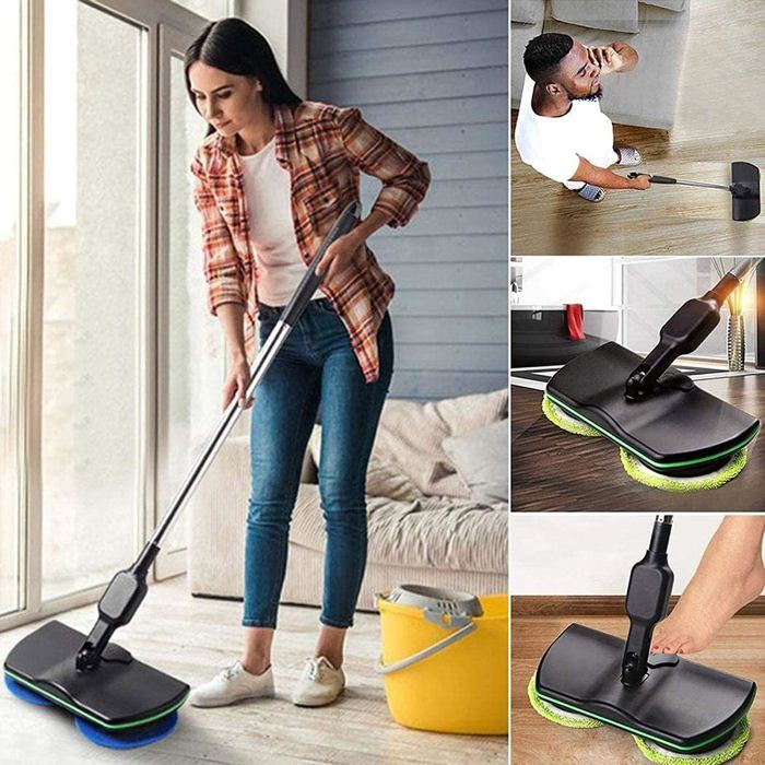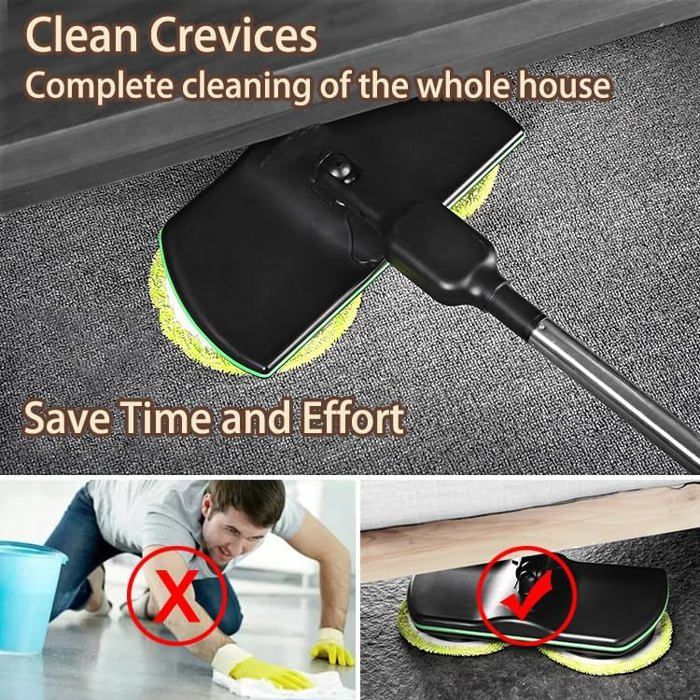 【Dual Rotating Mop Head】La serpillière électrique sans fil est conçue avec deux moteurs qui tournent à des vitesses allant jusqu’à 150rpm, ce qui pousse automatiquement la tête d’alimentation vers l’avant, vous permettant de vous débarrasser plus rapidement des taches et des saletés tenaces sur les sols de votre maison et de votre cuisine.