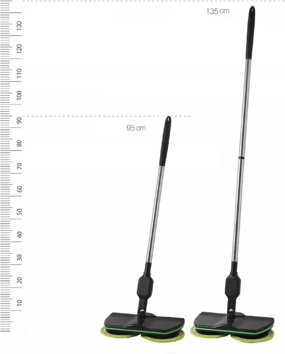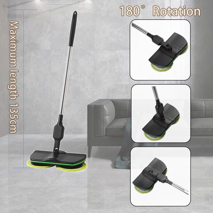 Matériau:ABS + batterie au lithium + acier inoxydable Poids:environ 1,6 kg Taille du poteau:106,5 cm Longueur totale du produit:130 cm Couleur:Noir Liste de colisage:1x vadrouille 3x tampons en microfibre 3x pads, 1x adaptateur de charge