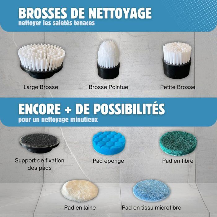 | Outils inclus | Composants inclus:Différentes brosses, plusieurs accessoires inclus |