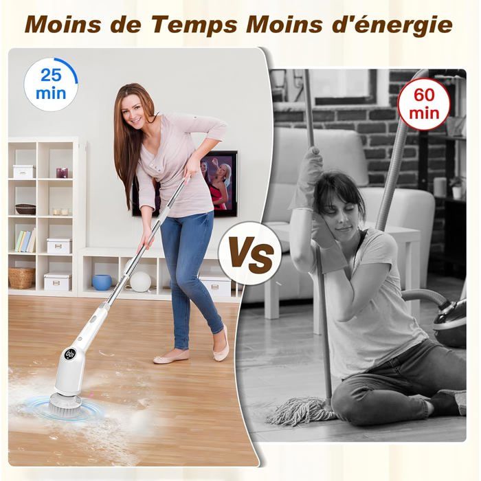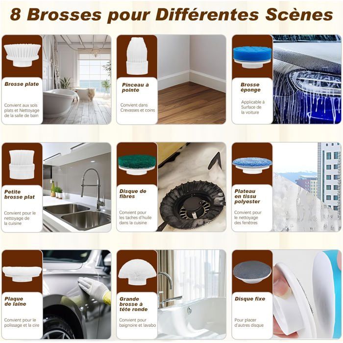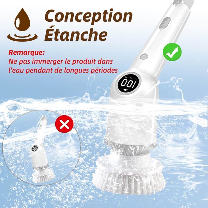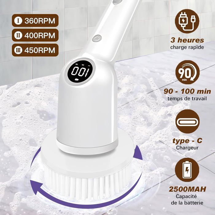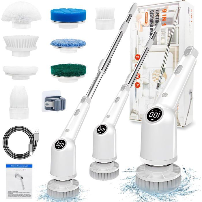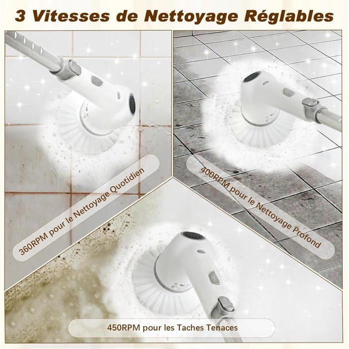 Nettoyant multifonctionnel nettoyage electrique sans fil Kazaigou avec 8 têtes de rotatives, adaptée au nettoyage de la salle de bain, de la baignoire, de la douche, du comptoir, de la cuisinière, de l’évier, du verre, du banc de cuisson, du carrelage, de la baignoire, etc. Crochet inclus, il est facile de fixer l’electrique nettoyage à suspendre au mur pour le chargement ou le stockage. 3 Vitesses Réglables Avec la de nettoyage électrique à 3 vitesses d’essorage réglables, elle répondra à vos différents besoins. Mode basse vitesse à 360 tr/min pour le nettoyage quotidien, mode vitesse moyenne à 400 tr/min pour le nettoyage de la voiture, etc. Mode haute vitesse à 450 tr/min pour un nettoyage en profondeur. Économ z du Temps et des Efforts la de nettoyage électrique Kazaigou peut être étendue sur trois longueurs, de sorte que vous n’avez pas besoin de vous pencher ou de vous agenouiller pour frotter la baignoire et le sol. Il est très simple de nettoyer les surfaces sans fatigue et de réduire drastiquement votre temps de travail de 1 heure à 30 minutes. Batterie Haute Capacité Équipé d’une batterie de 2 500 mAh, d’une de nettoyage électrique haute capacité, qui peut fonctionner en continu jusqu’à 1,5 heure après une charge complète. Avec un affichage numérique LED de l’utilisation de la batterie, vous n’aurez jamais à vous soucier de manquer d’énergie. Nettoyage étanche et sûr la résistance à l’eau de notre autolaveuse de sol de salle de bain est IPX4 et elle est hautement scellée, ce qui empêche l’eau et les environnements humides sur la machine. Le boîtier empêche les projections d’eau, ce qui prolonge la durée de vie. Ne plongez pas la de douche électrique dans l’eau.