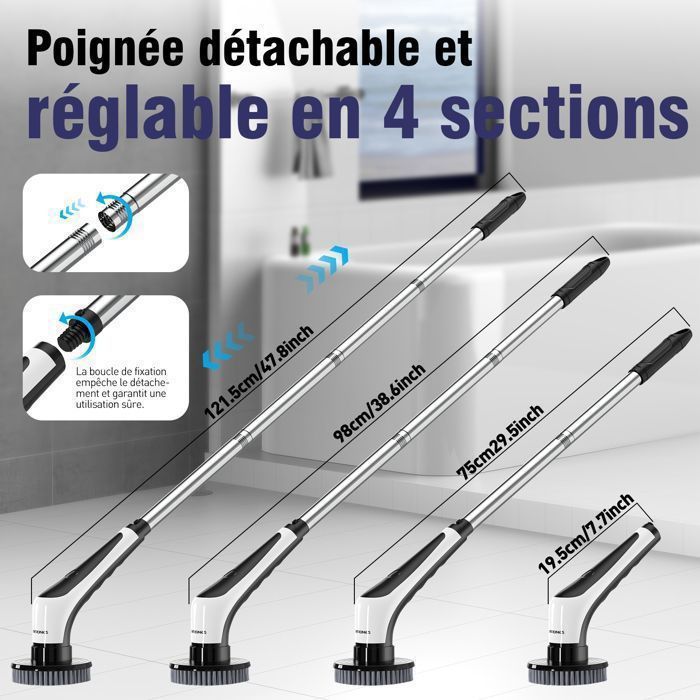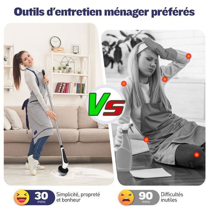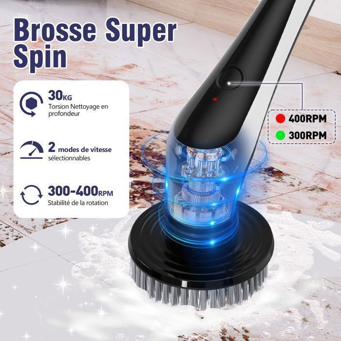 Avec une rotation puissante de 300 à 400 tours par minute, elle élimine facilement les taches tenaces telles que les traces de graisse dans la cuisine ou le calcaire dans la salle de bain, tout en vous faisant économiser 90 % d’efforts. Équipée de 4 têtes de brosse et d’un manche extensible, elle couvre tous les types de surfaces, du sol à la baignoire en passant par les jantes de voiture. Entièrement étanche (IPX8), elle offre une autonomie de 120 minutes et permet de résoudre tous les problèmes de nettoyage de la maison.