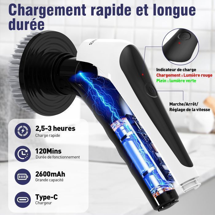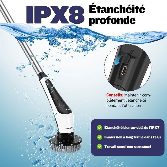 【Type C Rechargeable et Grande Autonomie】Brosse rotative nettoyage avec la dernière technologie de charge rapide USB-C et l’indicateur de batterie, vous n’avez pas à vous soucier de manquer d’énergie.Trois heures de charge rapide suffisent pour 90 minutes de travail de longue durée. Cette brosse de nettoyage sans fil utilise une batterie à haut débit de 2600mAh. 【Modernisation de l’épurateur de Puissance】 l’autolaveuse Homtronics est plus puissante, elle est conçue avec 2 modes de contrôle de la vitesse : ① High Speed Mode : 400 r/min et ② Mode basse vitesse : 350 r/min. Il suffit d’appuyer une fois sur le bouton ON/OFF. Nous avons conçu 2 modes de contrôle de la vitesse, brosse nettoyage electrique ce qui signifie une vitesse modérée et raisonnable pour s’assurer que les eaux usées n’éclaboussent pas de manière aléatoire lors du nettoyage.【IPX8 Imperméable + Sans Fil Design】Brosse rotative nettoyage à essorage est IPX8 niveau d’étanchéité du corps entier, ce qui lui permet de travailler dans l’eau pendant une longue période sans dommage.Équipée d’une batterie de grande capacité de 2600mAh, brosse de nettoyage electrique peut fonctionner pendant 120 minutes après 3 heures de charge rapide Type-C (adaptateur non inclus).【Efficacité du Nettoyage】Brosse nettoyage electrique sans fil peut supporter un poids allant jusqu’à 30 kg, peut éliminer les taches tenaces sans interruption sous pression et réduire le temps de nettoyage de 70 minutes à seulement 30 minutes, ce qui permet d’économiser du temps et des efforts, d’éliminer les maux de dos et les problèmes articulaires causés par le nettoyage de la maison avec un chiffon à la main.【Cadeau Idéal pour Votre Famille】Homtronics s’est spécialisé dans les articles de maison et de cuisine pendant de nombreuses années. Nous nous engageons à fournir plus d’outils de nettoyage pour vous aider, vous et votre famille, à nettoyer plus facilement.