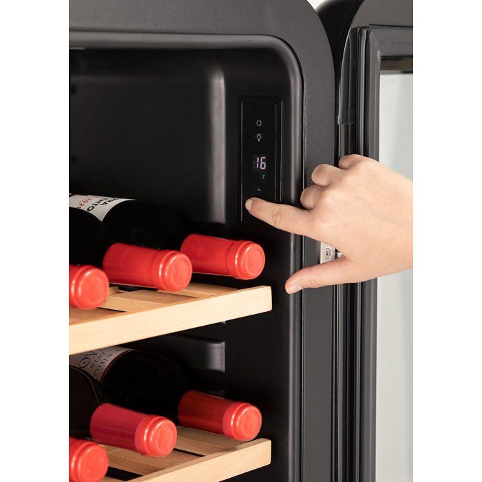 La cave à vin électrique WINECOOLER RETRO de Create est conçue pour stocker vos bouteilles de vin dans des conditions optimales. Disponible en trois capacités, elle peut accueillir 12, 45 ou 76 bouteilles, selon le type d’étagères choisi. La cave offre un contrôle de température numérique réglable entre 4°C et 22°C, permettant de maintenir une humidité et une luminosité idéales pour la conservation du vin. Son design rétro est complété par des finitions lisses et arrondies, et elle est équipée d’un système anti-vibrations et d’un éclairage intérieur LED basse consommation, qui n’émet aucun spectre de lumière bleue pour éviter l’altération des pigments et des tanins du vin. Le corps de la cave est fabriqué en acier inoxydable, garantissant durabilité et résistance. Eco-responsable, elle utilise le réfrigérant isobutane R600a, sans impact sur l’environnement et sans danger pour la couche d’ozone. Les étagères sont en bois de hêtre naturel, et la cave est conçue pour des bouteilles de 75 cl, telles que bordelaise, bourguignonne, de Jerez, champenoise et de Cava, ne dépassant pas 30 cm de hauteur. Notez qu’elle n’est pas adaptée aux bouteilles de type vin du Rhin de 75 cl.