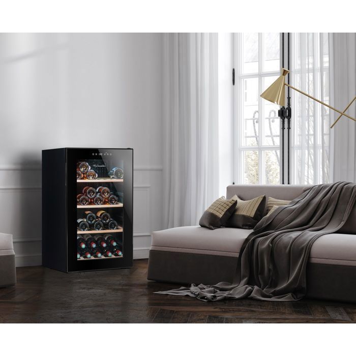 La cave à vin de service LS52BLACK de La Sommelière est une solution performante et élégante pour conserver jusqu’à 52 bouteilles à température idéale. Simple zone, elle permet un réglage précis entre 5 et 20°C, directement via son panneau de commande tactile intégré à la porte, sans besoin de l’ouvrir. Cette fonctionnalité assure la stabilité de la température intérieure et facilite les réglages. Son design moderne noir avec poignée intégrée et porte vitrée double vitrage s’harmonise facilement avec tous les styles d’intérieurs. L’éclairage LED met en valeur votre collection, tandis que les clayettes fixes en bois de hêtre (3 complètes et 1 demi-clayette) offrent un rangement robuste et esthétique. Grâce à son système anti-vibration, sa répartition homogène du froid et son hygrométrie naturelle, vos bouteilles sont conservées dans des conditions optimales. Silencieuse avec seulement 37 dB, la LS52BLACK est idéale pour les espaces de vie. Facile à installer grâce à ses deux pieds réglables à l’avant et ses roulettes à l’arrière, elle s’adapte à tous les environnements. Avec une classe énergétique F et une consommation maîtrisée, elle associe efficacité et respect de l’environnement. Capacité calculée selon la norme EN62552 avec des bouteilles bordelaises de 75 cl, en configuration standard. Pratique, performante et discrète, la LS52BLACK répond aux exigences des passionnés de vin.