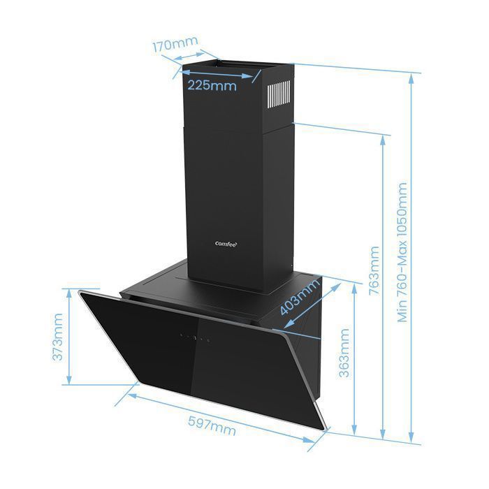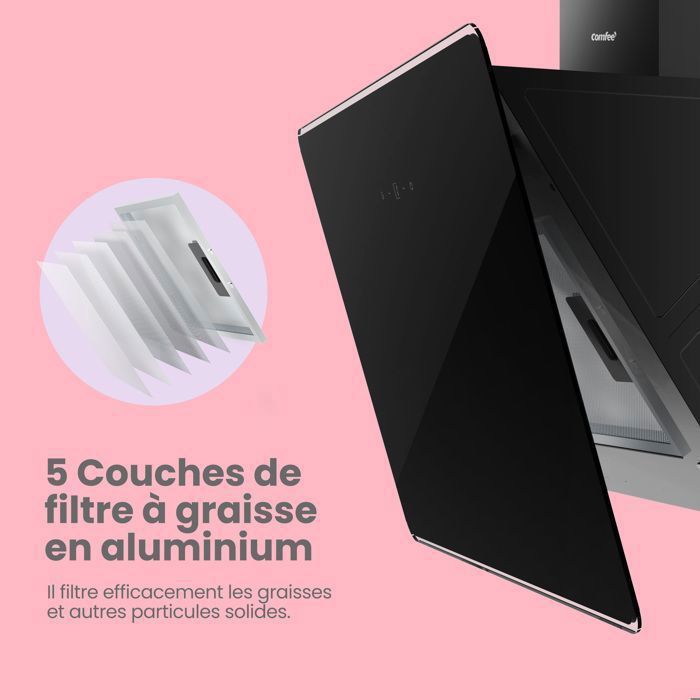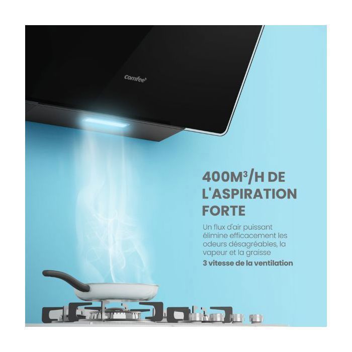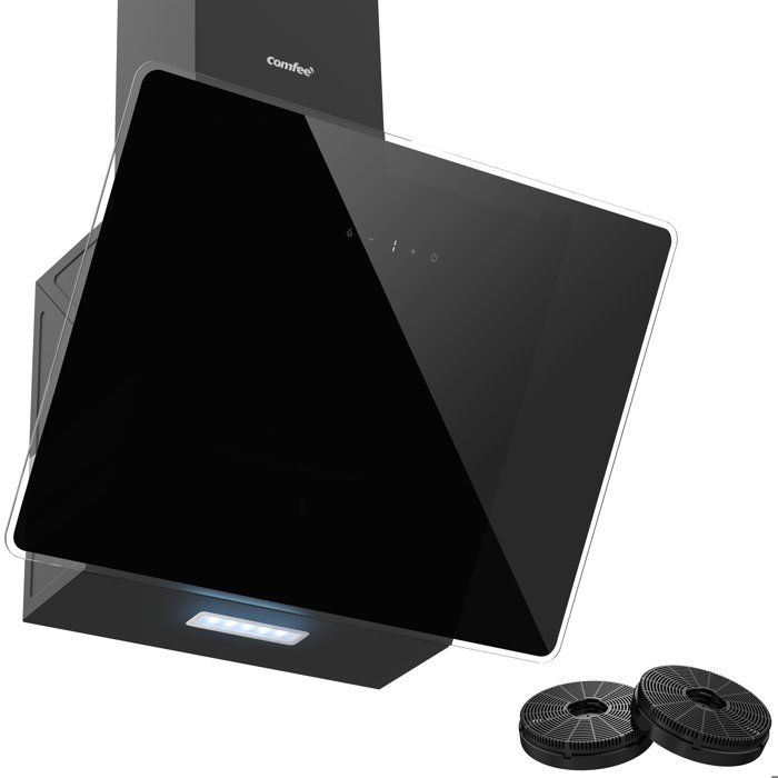 | Nom du produit | Comfee Hotte Aspirante Inclinée 60cm – 400m³/h – 2 Filtres à Charbon – 3 Vitesses – Commandes Sensitives – Verre Noir |