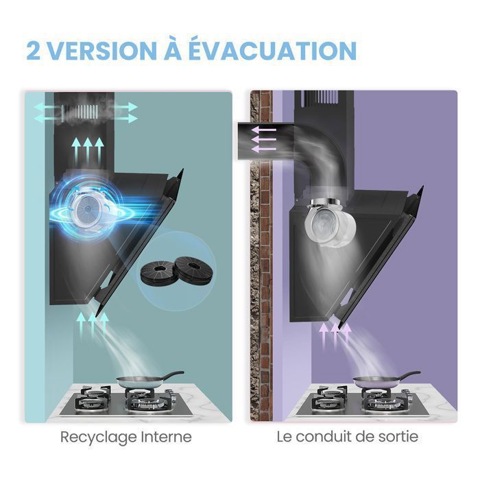 | Type d’extraction d’air | Extraction & recirculation avec conduit d’air & filtre à charbon actif (y compris) |