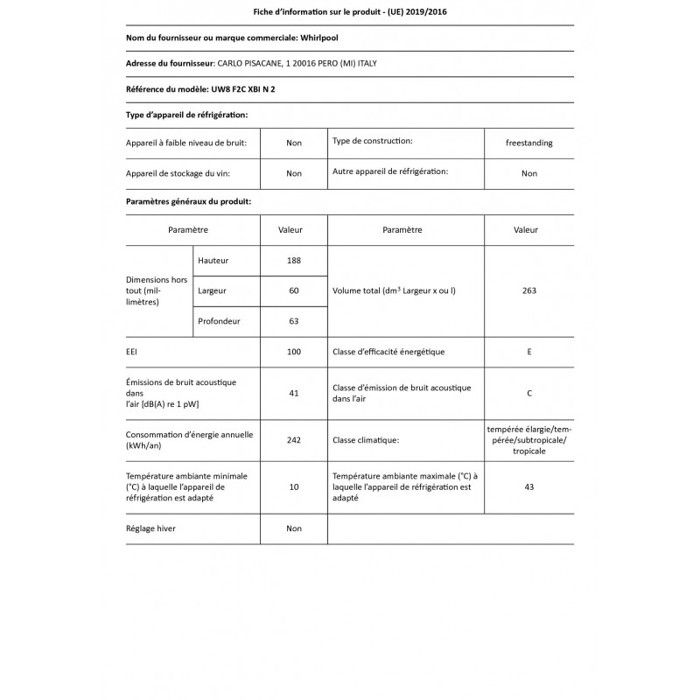 | Nom du produit | Congélateur Armoire WHIRLPOOL UW8F2CXBIN2 |