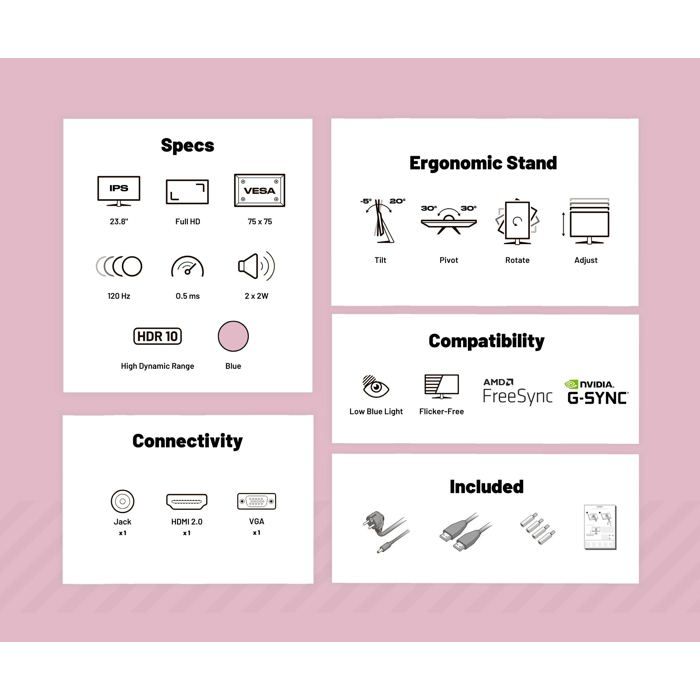 • Écran PC Gamer 23.8″ IPS Full HD : Dalle IPS 1920×1080 à 120Hz, 0.5ms, design rose pastel, réglable en hauteur et inclinaison (HSP), haut-parleurs intégrés, G-Sync/FreeSync. Garantie 2 ans.