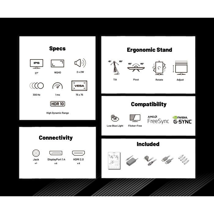 • Écran PC Gamer 27″ IPS WQHD : Dalle IPS 2560×1440 à 300Hz, 1ms, HDR, ergonomie HSP, haut-parleurs intégrés, sRGB 100%, G-Sync/FreeSync. Garantie 2 ans.