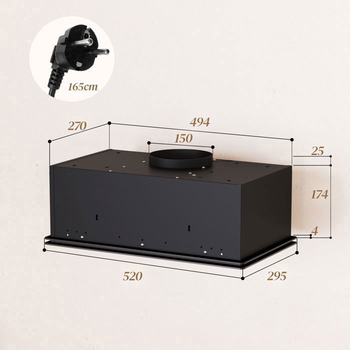 Efficacité énergétique : AConsommation moyenne d’énergie : 22,6 kWh/an*.Rendement du moteur : 50Niveau sonore : 50,1 dBLongueur du cordon d’alimentation (cm):165cmLongueur du cordon d’alimentation (cm):130cmHauteur de l’appareil sans cheminée (mm):203mmDistance minimale entre l’appareil et la plaque de cuisson électrique : 650 mmDistance minimale de la plaque de cuisson au gaz : 650 mmPoids net (kg):5KG Dimensions de l’appareil (L*L*H) 520*295*198mmMode de contrôle : interrupteur à touche pianoRéglage du niveau de puissance : 3Mode de sortie d’air maximale de la soufflerie (m3 / h) : 350m³/hMatériau du filtre à graisse : aluminiumTension (V) : 220-240VFréquence (Hz) : 50/60HZType de fiche : fiche française à tête courbe à trois brochesCharge totale connectée : 79WType d’installation : encastrée