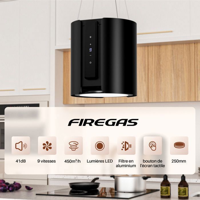 | Nom du produit | FIREGAS Hotte îlot Centrale A 380m ³/ h 39.5cm – Hotte Aspirante 4 Vitesses – Hotte Suspendue Recyclage -Noir-Classe énergétique A |