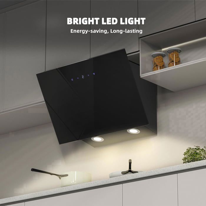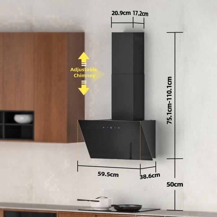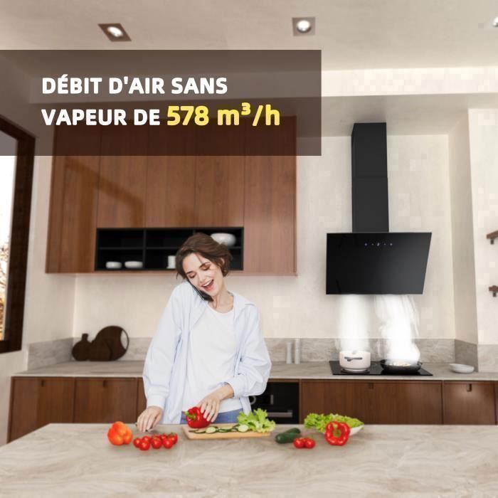 FIREGAS Hottes Aspirantes 60cm, Hotte de Cuisine Inclinée, 578m³/h Puissance d’aspiration élevée, Evacuation ou Recyclage, Commande Tactile, Lumières LED, 2 Filtre à Charbon, Classe A++