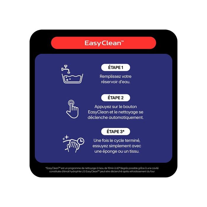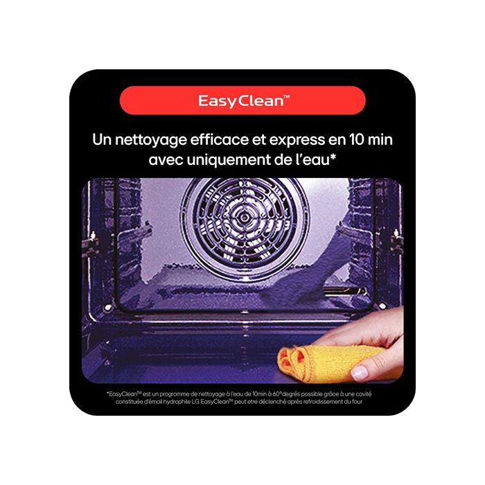 Ce programme permet un nettoyage vapeur rapide en seulement 10 minutes. Moins énergivore que la pyrolyse, il réduit la chaleur et la fumée grâce à un émail breveté par LG.Design élégant et minimaliste