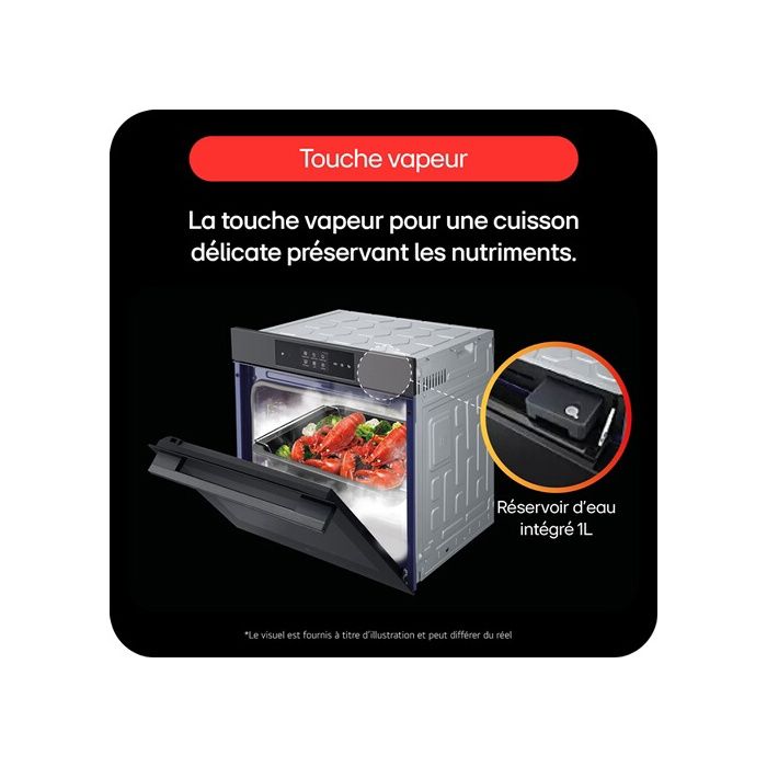 Une solution innovante et élégante pour une cuisson optimale et uniforme! Le four encastrable LG WS9D7672CS, sera votre allié idéal en cuisine, vous pourrez cuisiner des plats traditionnels, du plus simple au plus élaboré, en passant à une cuisson saine avec la vapeur.34 programmes automatiques, vous faciliteront la mise en route du four, avec une parfaite précision. Modes de cuisson- Chaleur tournante- Eco- Voûte & sole- Rôtissage- Pizza- Gril- Air Fry- Sous-vide- Séchage- Maintien au chaud- Décongélation- Fermentation- Chauffe-plat, etc. InstaViewGrâce à cette technologie, il suffit de toquer deux fois sur la porte du four pour voir l’intérieur sans l’ouvrir. Même les mains prises, vous pouvez vérifier la cuisson sans perte de chaleur. ProBake ConvectionLa technologie ProBake Convection™ assure une chaleur constante et précise sur chaque grille. Dotée de deux résistances et d’un système à deux vitesses, elle garantit une montée en température rapide et s’adapte à tous les types de cuisson. Cuisson vapeurCe four est équipé d’un générateur de vapeur et d’un réservoir d’eau d’un litre. La technologie LG Steam™ diffuse chaleur et humidité de manière homogène, préservant ainsi la texture et les nutriments des aliments. Grande capacitéAvec un volume généreux de 76 litres, ce four est idéal pour les grandes familles ou les repas festifs. Il permet de cuire plusieurs plats simultanément ou de préparer de grandes pièces comme un rôti. PyrolyseCe mode nettoyage, désintègre les salissures à une température d’environ 500°C. Porte froideEquipée d’une couche de 4 verre, aucun risque de brûlure pendant la cuisson ou bien le cycle de nettoyage. EasyClean™ SteamCe programme permet un nettoyage vapeur rapide en seulement 10 minutes. Moins énergivore que la pyrolyse, il réduit la chaleur et la fumée grâce à un émail breveté par LG. Design élégant et minimalisteLe design sobre et raffiné du four LG s’intègre parfaitement dans toutes les cuisines. Sa poignée ergonomique