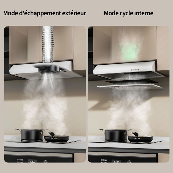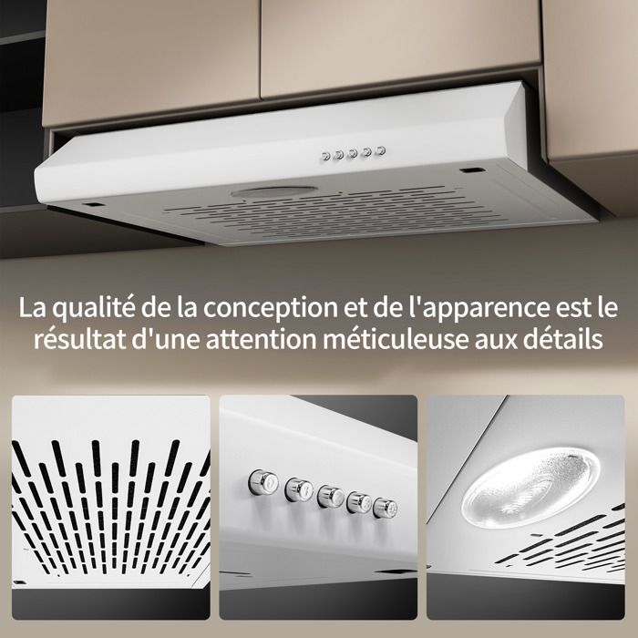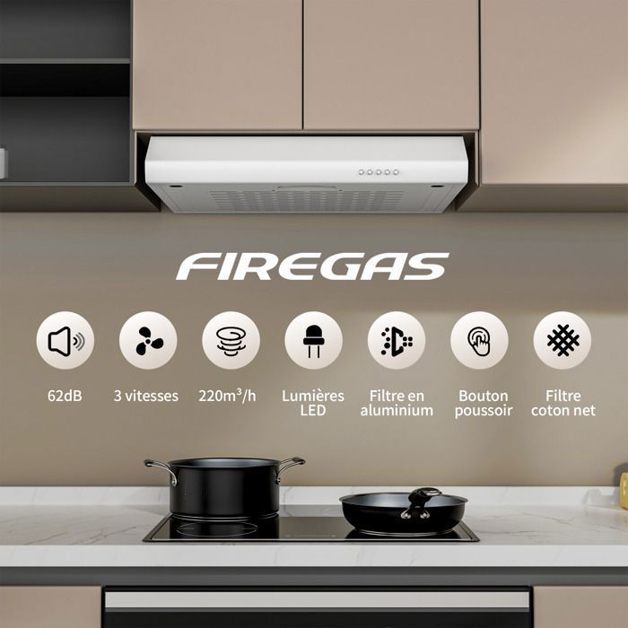 Nom du produit Hotte Aspirante Casquette Visière 60cm FIREGAS -3 Vitesses – Évacuation et Recyclage – Classe B – Filtre en Coton – Blanc