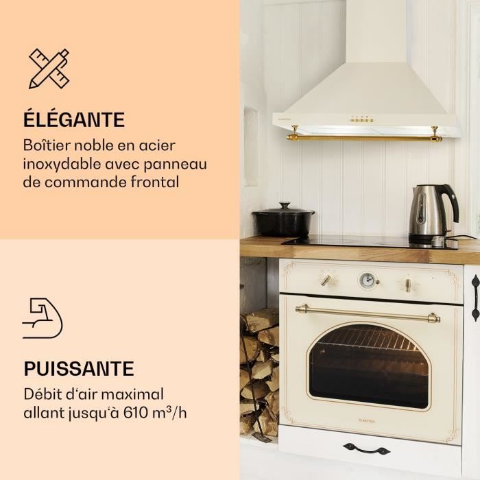 | Nom du produit | Hotte aspirante – Klarstein Montblanc 60 – 610 m³-h – 165 W – 2 x 1,5 W – LED – Crème |