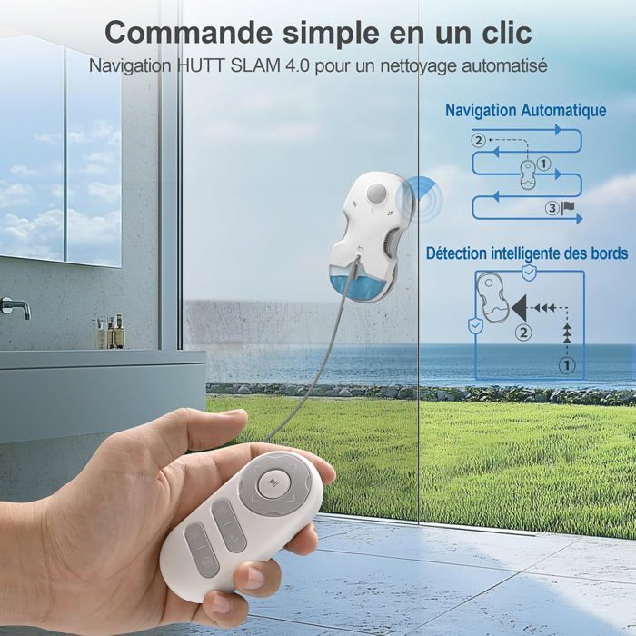 【Adhésion Puissante et Stable】Des tampons à ressort et un châssis incliné vers l’intérieur assurent une aspiration stable et un nettoyage plus efficace des bords, le robot nettoyeur vitre grimpe aisément même sur des cadres de fenêtres humides. 20 % plus rapide.【Technologie de Pulvérisation HydroJet】Jet grand angle à pompe de 20 microns toutes les 5 secondes avec réservoir visible de 80 ml(60m² par charge) pour couverture totale et nettoyage en profondeur. Compatible avec les nettoyants non corrosifs.【Planification Intelligente du Trajet】Navigation HUTT SLAM 4.0, Son capteur haute précision détecte les bords et les obstacles, garantissant un déplacement fluide, même sur les fenêtres sans cadre. Après le nettoyage, il retourne automatiquement à son point de départ.【Protections Multiples】Corde de sécurité alpiniste + compensation de pression en 0.04s. Sa batterie de secours intégrée maintient l’aspiration pendant 25 minutes en cas de coupure de courant. Le design combiné du câble d’alimentation et de la corde de sécurité évite les enchevêtrements, le facteur de sécurité.【Contrôle Facile par Télécommande】Un seul bouton pour démarrer ! Pilotez le robot vitre nettoyage à distance et atteignez les zones les plus inaccessibles en toute simplicité. Gagnez du temps et profitez de fenêtres toujours propres.【 Contenu】1 HUTT S7, 1 boîte de rangement, 1 chargeur, 5 buses, 1 corde de sécurité, 5 lingettes, 1 télécommande, 1 flacon, 1 manuel. Astuce : Ajoutez quelques gouttes de nettoyant vitres ou d’alcool sur la lingette.