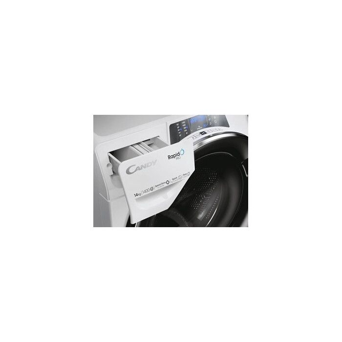 Lave-linge hublot Candy RP 4146BWMBC/1-S avec une capacité de 14 kg, idéal pour 5 personnes. Essorage à 1400 tours/min, niveau sonore de 51 dB. Connectivité Wi-Fi, tambour de 85 L et fonction vapeur pour un lavage efficace et hygiénique. Dimensions : 60 x 85 x 69.5 cm.