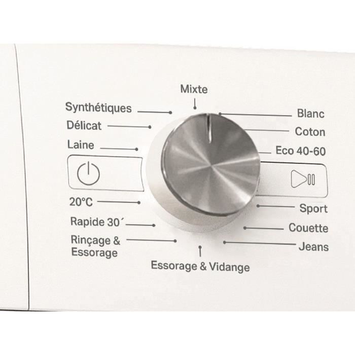 Programmes et options Programmes : Mixte – Blanc – Coton – Eco 40-60 – Sport – Couette – Jeans – Essorage & Vidange – Rinçage et Essorage – Rapide 30′ – 20°C – Laine – Délicat – Synthétiques.
