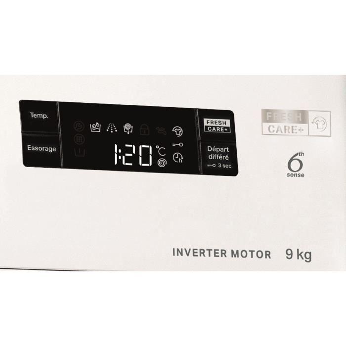 Lave-linge frontal – Avec sa capacité généreuse de 9 kg et une vitesse d’essorage de 1200 tours/min, ce modèle est idéal pour les familles – Grâce à la technologie FreshCare+, vous bénéficiez d’un linge frais jusqu’à 6 heures après la fin du cycle grâce à la vapeur et au brassage – Le programmateur intelligent 6ème Sens ajuste automatiquement la durée et la consommation d’eau en fonction de la charge et du type de tissu, permettant des économies d’eau et d’énergie – Ce lave-linge est équipé d’un moteur induction robuste et silencieux, réduisant les vibrations pour un fonctionnement agréable – La classe énergétique A et une consommation d’eau de seulement 50 L par cycle garantissent des performances optimales – Avec 14 programmes, dont un cycle rapide de 30 minutes, il s’adapte à tous vos besoins de lavage – Interface digitale et départ différé pour plus de flexibilité au quotidien.