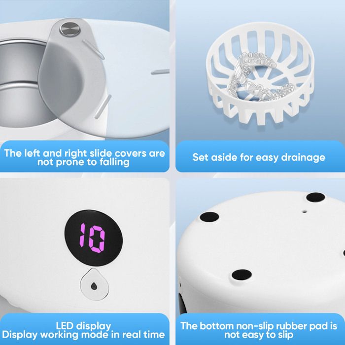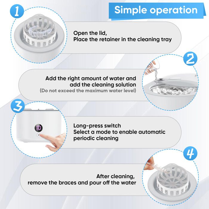 [4 Modes de Nettoyage]: ce nettoyeur à ultrasons est équipé de 4 modes de nettoyage, à savoir 2 minutes de nettoyage rapide, 3 minutes de nettoyage quotidien, 5 minutes de nettoyage en profondeur et 10 minutes de nettoyage continu. Il peut vous aider à éliminer efficacement la saleté, la poussière, la graisse, etc. sur les appareils dentaires. Le couvercle coulissant transparent vous permet de surveiller l’état des articles à tout moment.