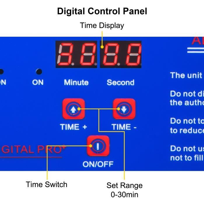 • Panneau de Commande Numérique: Réglage du temps de travail : 0-30 minutes. Le nettoyeur à ultrasons dispose d’un panneau de commande numérique avec une minuterie réglable. L’écran LED est conçu pour afficher le temps de travail prédéfini et le compte à rebours, parfait pour un contrôle précis du temps de lavage.