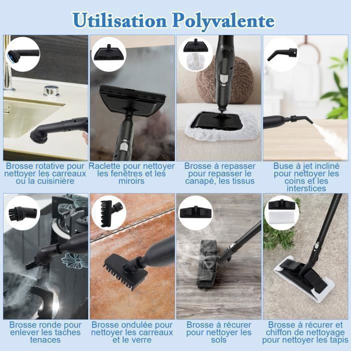 Kit de nettoyage polyvalent: Ce nettoyeur vapeur est livré avec une gamme d’accessoires pour répondre à divers besoins de nettoyage. Des sols et fenêtres aux poêles, carreaux, tapis, tissus d’ameublement et papiers peints, cette machine de nettoyage polyvalente offre une grande efficacité de nettoyage.