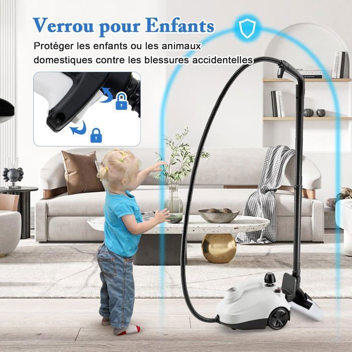 Fonctionnalités de sécurité améliorées: Cette machine de nettoyage est équipée d’un verrouillage enfant pour un environnement de nettoyage sécurisé à la maison. De plus, le verrou de gâchette et la soupape de sécurité empêchent la libération de vapeur, tandis que le manomètre permet de surveiller la pression interne de manière efficace.