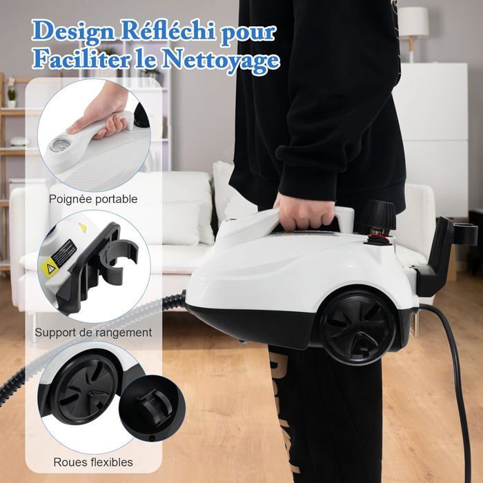 Facilité de manœuvre: Les roues intégrées et la poignée portable permettent de déplacer facilement l’appareil dans toute la maison. Équipé d’un cordon d’alimentation de 5 m et d’un tuyau souple de 146 cm, le nettoyeur vapeur à roulettes vous permet d’atteindre facilement les endroits difficiles à nettoyer.